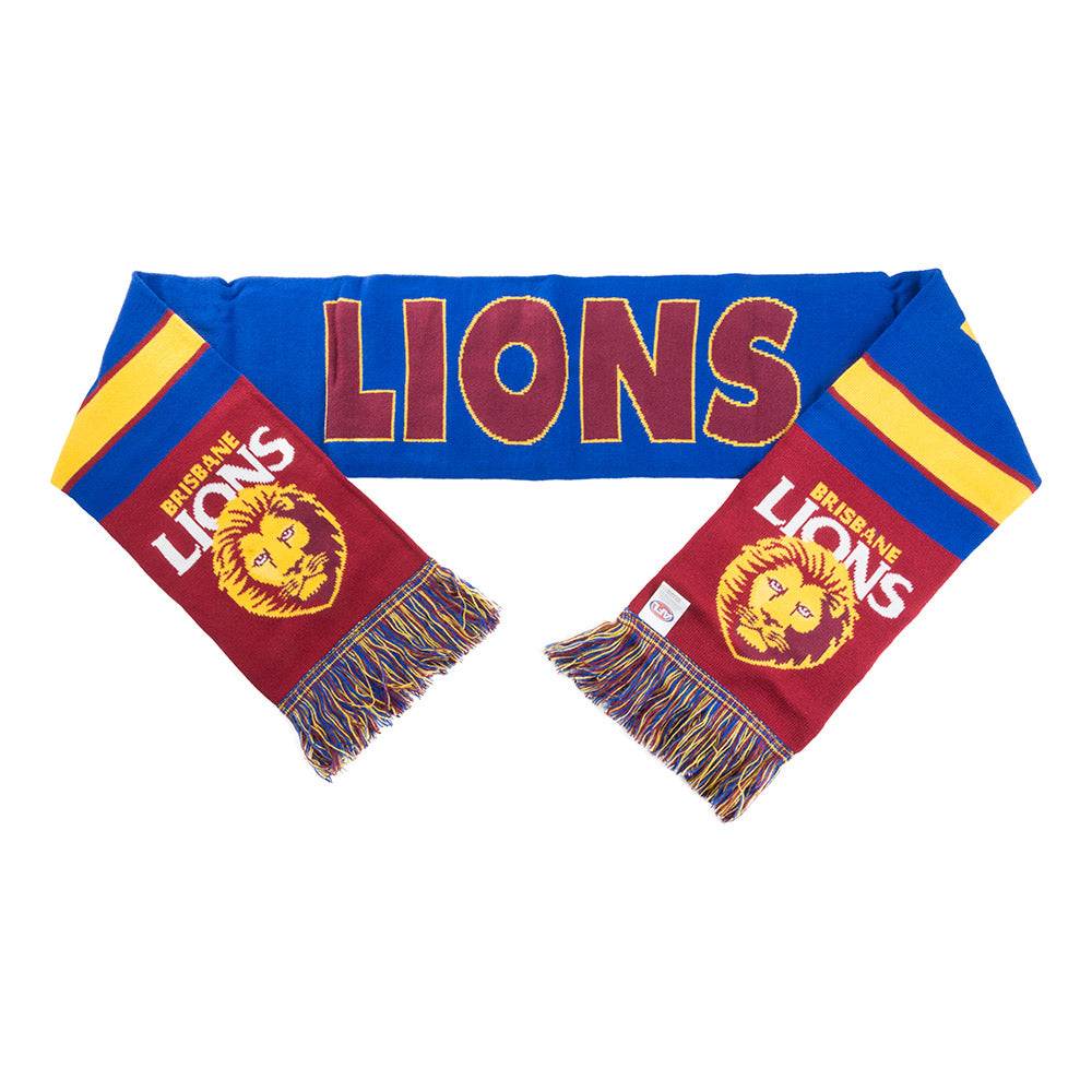 - Brisbane Lions Retro Scarf- Fully Knitted Jacquard Scarf Featuring Current Club Logo and Iconic Retro Logo on The Reverse Side- Tassels in team colours- 100% Acrylic- Dimension: 165CM X 19CM- Official AFL Merchandise